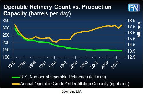 In 1983 those same 301 refineries produced 17.9 million barrels a day of diesel, gas, jet fuel, and dozens of other products. By early 2014 the fleet of 143 domestic US refineries will meet or surpass the production capacity last seen when appropriately “Dallas” was the #1 TV show in the land.