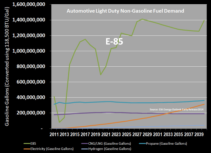 So that crazy squiggly green line on the chart, that is E85. Why is it the most varied of all the alternatives? Well because the EPA hasn’t quite figured out what we are going to do with the RFS2. That is a whole other story that we’ll cover in the future, but suffice it to say that of all the forecast’s components that could be “wrong” that one certainly has the biggest chance of being far from the mark.
