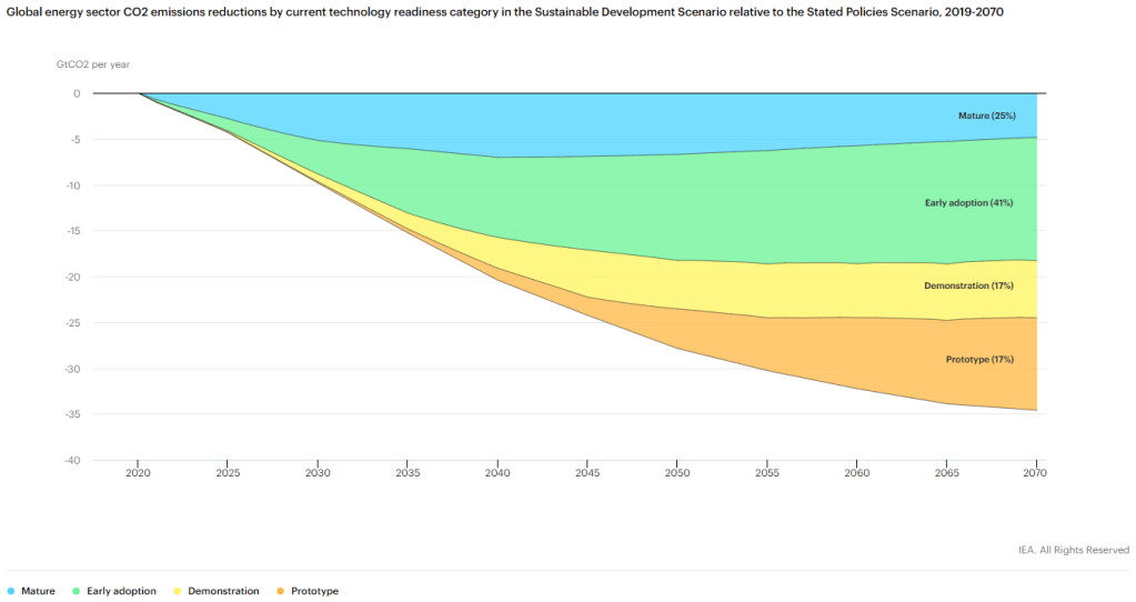 I like the chart below that by applying their four stages of innovation, Prototype, Demonstration, Early Adoption, and Mature, to emerging energy technology depicts how the IEA arrived at their 75% gap conclusion. Important to note that the timescale here is indeed decades with needed reductions in CO2 emissions not being realized until 2070.