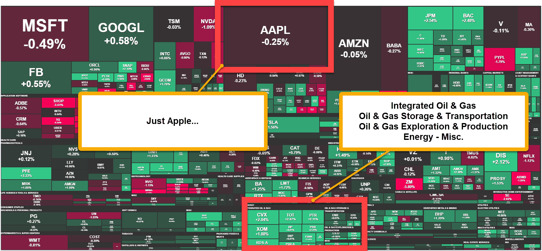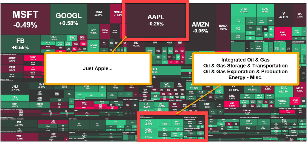 The shapes aren’t perfect match but the area covered by Apple at approximately $2 Trillion dollars more than covers Integrated Oil & Gas, Oil & Gas Transportation & Storage, Oil & Gas Exploration & Production as well as what they call Energy Misc. which includes companies like Phillips 66, Marathon, Valero, and Schlumberger.