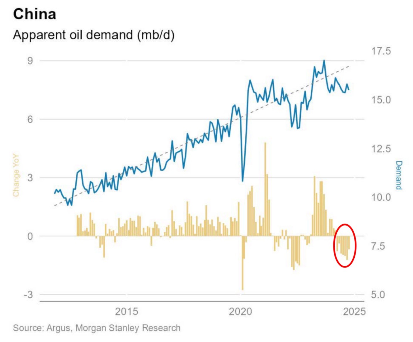 While it is still small we are possibly seeing the first impacts on oil demand from this level of EV penetration. China, which accounted for half of all oil demand growth in the world over the past 20 years, looks to have hit an inflection point, losing over 2 million barrels a day of demand over the course of 2024, (Figure 2). There is a recession afoot in China, so it’s important to not over rotate on this data point, but at around 50% adoption rate for new vehicle sales we are going to see an impact.