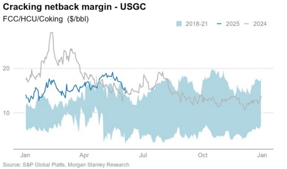 While OPEC+ production remains steady (despite higher quotas), product markets are showing signs of surplus, especially for diesel and jet fuel. In my view this reinforces Morgan Stanley’s outlook of a well-supplied market which all points to possible downward pressure on refining margins in the second half of 2025.